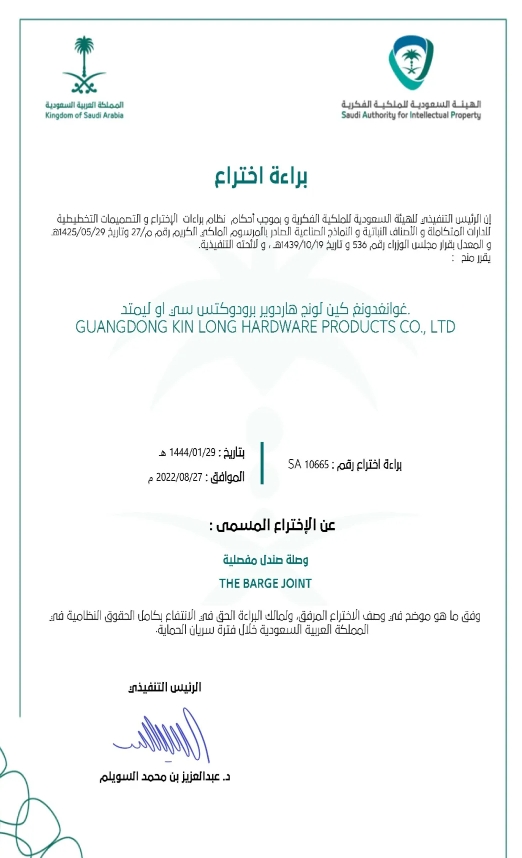近日 神马影院,广东坚朗五金制品股份有限公司分别获得中华人民共和国国家知识产权局,印度专利局,沙特阿拉伯专利局颁发的发明专利证书, 驳接头.